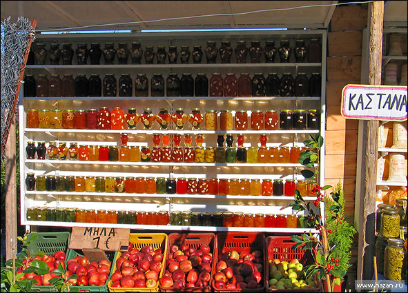 Мед - банки с ярким разноцветным медом, в котором плавают фрукты, ягоды и орехи - хорошее напоминание о солнечных днях в Греции.